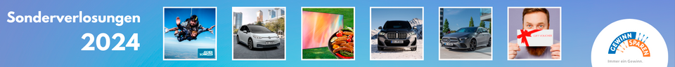Hier stehen Ihnen die Banner mit den Sonderverlosungen des ersten Halbjahres 2024 im Überblick in den verschiedenen Größen und Formaten zur Verfügung. Diese können Sie auf Ihrer Internetseite einbinden.